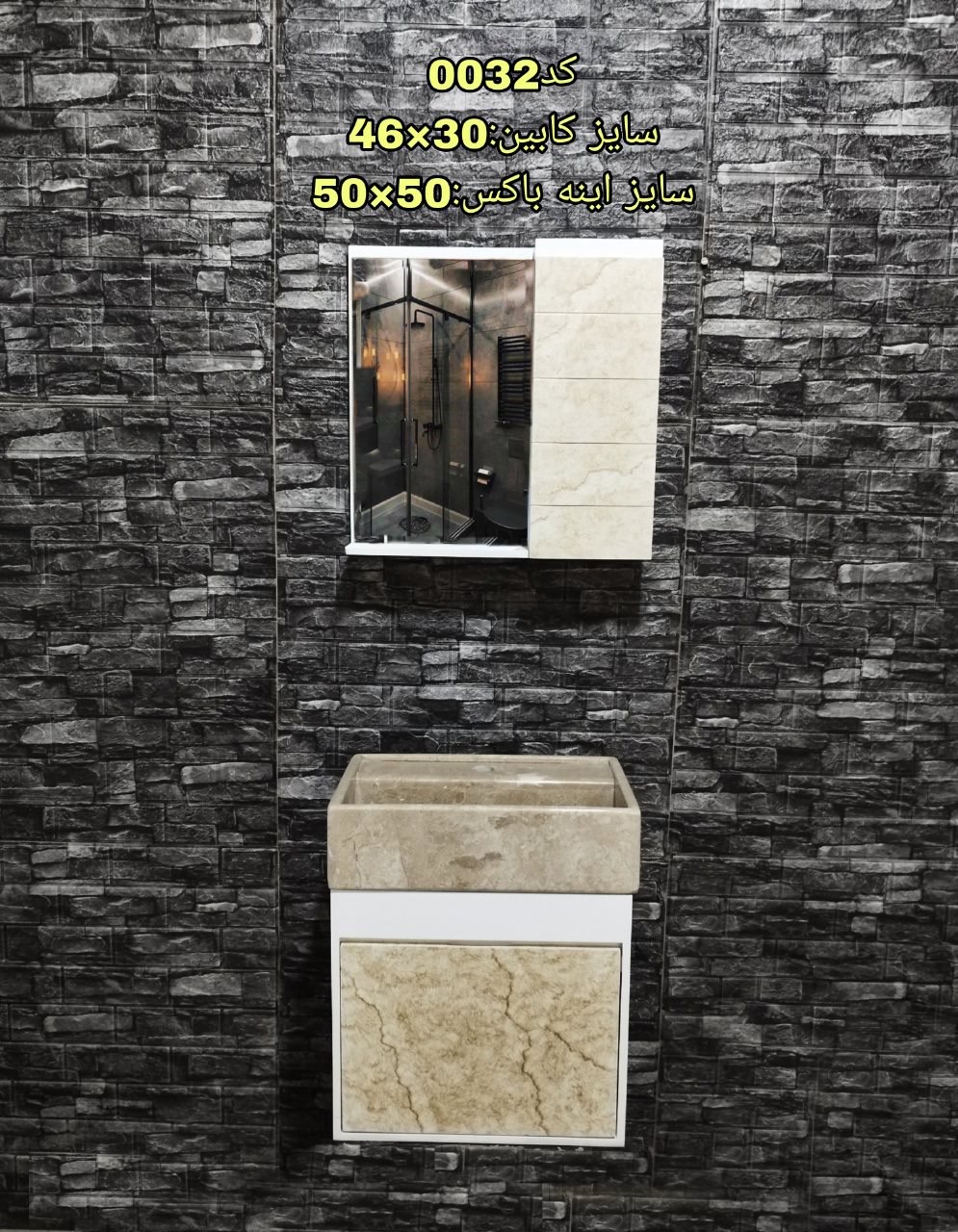 ست روشویی کابینتی و اینه باکس ضد اب موجود در دو طرح کرم و طوسی ( طرح سنگ طبیعی)