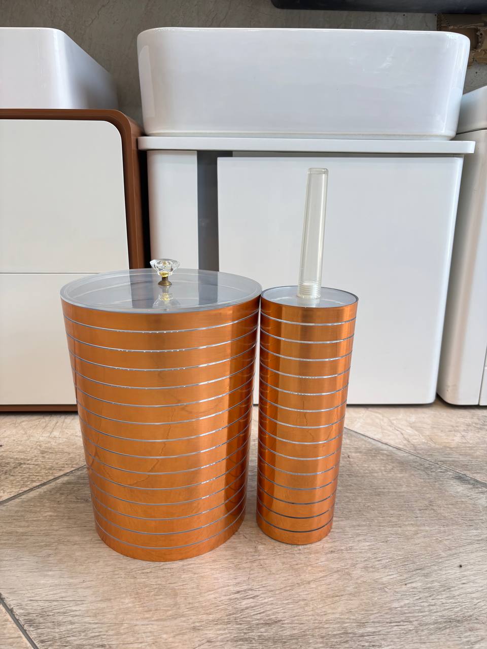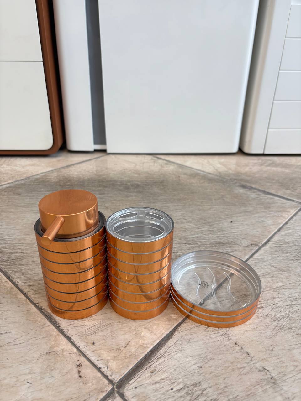 “ست سرویس بهداشتی ۵ پارچه طرح مسی با طراحی منحصر به فرد، شامل جای صابون، جا مایع، جا مسواکی، جا دستمالی و سطل زباله. رنگ مسی مناسب برای تمامی دکوراسیونها، با جنس مقاوم و نگهداری آسان.”