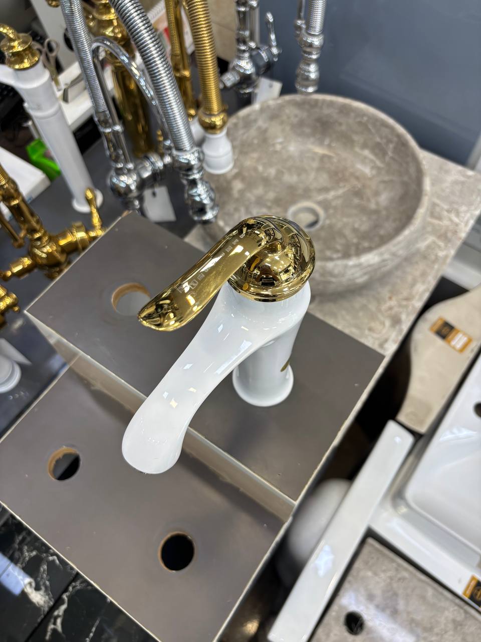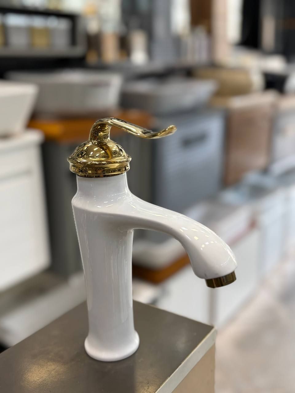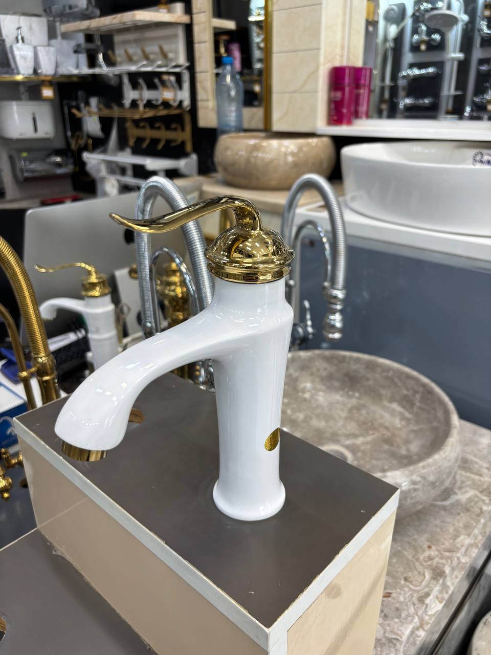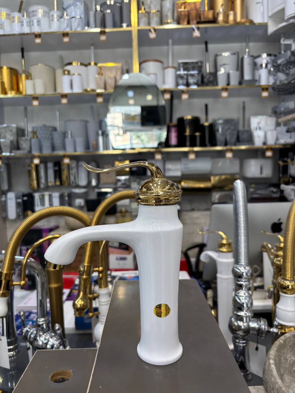 این شیر با طراحی سفید و طلایی لوکس، پایه بلند و بدنه برنجی، علاوه بر زیبایی، دوام و کیفیت بالایی ارائه میدهد.