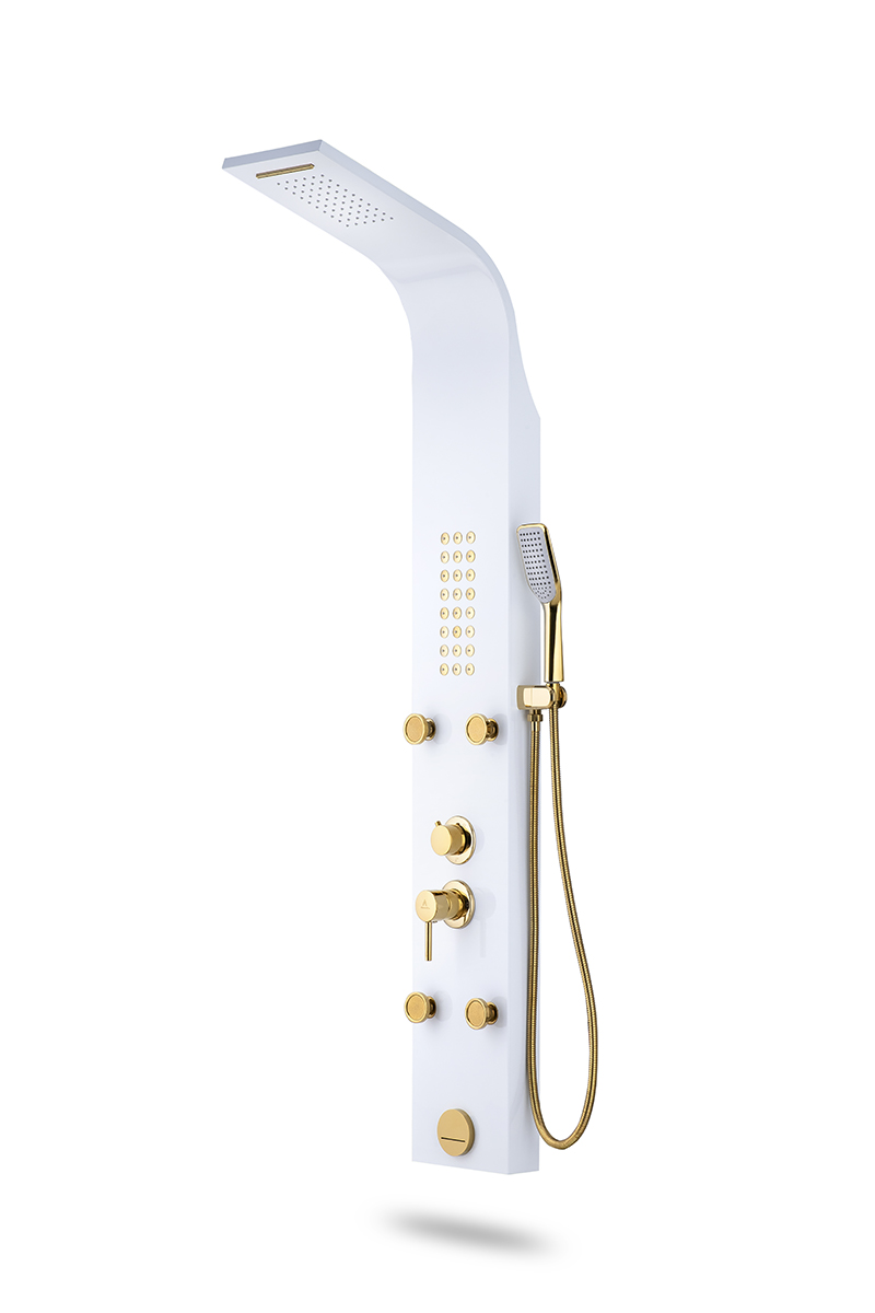 پنل دوش C آرامان — وارداتی، بدنه 304SS، سفید الکترواستاتیک با لوازم طلایی، ۳ سال ضمانت بدنه و ۵ حالت پاشش: بارانی، ماساژوری، جتدار، دستی، پاشور/لگنپرکن